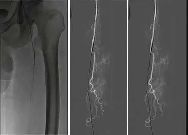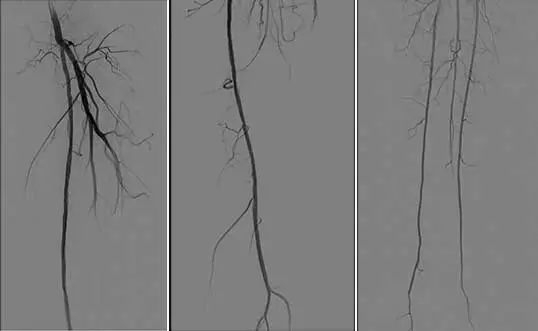 6、復查造影見:左股淺動脈血流通暢,殘余狹窄小于 30%,左下肢血供明顯改善,撤出鞘管,封合器封合右股動脈穿刺點,安返病房。