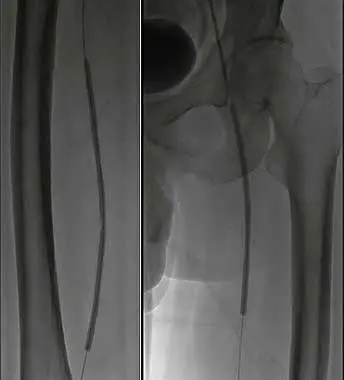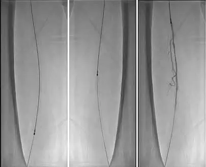 2、建立通路換入6F長鞘,遠端位于左股淺動脈。配合導絲導管技術通過左股淺動脈狹窄閉塞段。