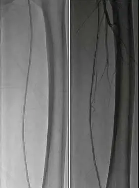 1、仰臥位,常規消毒鋪巾,2%利多卡因局麻。右股動脈穿刺入路,穿刺置管后,造影示:主動脈下段血流尚通暢,雙側髂總動脈輕度狹窄,髂外動脈及股總動脈血流通暢,右側股淺動脈、腘動脈輕度狹窄,左股淺動脈全程狹窄大于50%,中遠段閉塞約12cm。左腘動脈及雙側膝下流出道血流通暢。